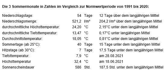 Mit einem Niederschlagsüberschuss von 204,2 l/m² war der meteorologische Sommer 2021 der niederschlags-reichste Sommer seit Messbeginn 1966 und mit nur 40 Sommertagen (ab 25°C, Norm 55 Tage) und nur 7 Hitzetagen (ab 30°C, Norm 24,5 Tage) fielen die 187,5 Stunden zu sonnenscheinarmen Sommermonate 0,8°C zu kalt aus.