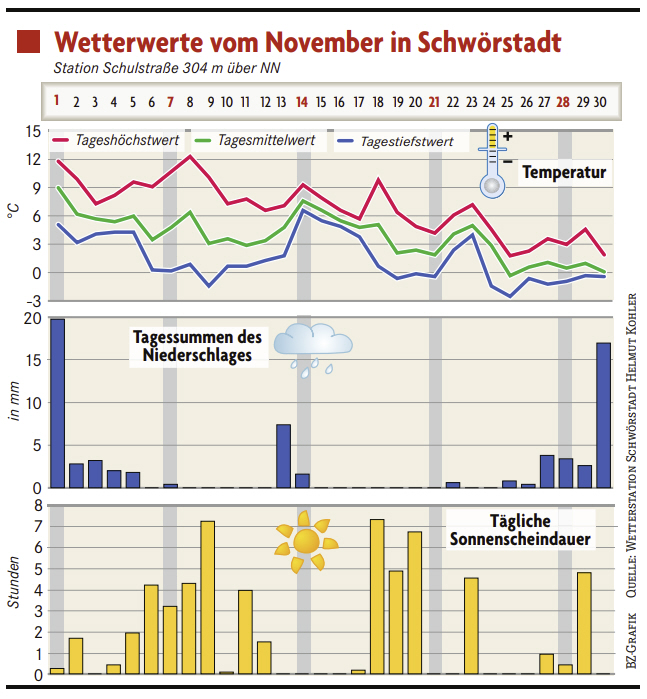 Der goldene Oktober ist Vergangenheit, denn pünktlich zum Start in den letzten Herbstmonat brachte die Kaltfront von Tief „Nael“ mit 19,8 l/m² Regen einen Wetterwechsel. Mit Unterstützung der Tiefs „Peter“ und „Rudolf“ blieb uns das trübe und feuchte Wetter bis zum 8. November mit weiterem 10,2 l/m² Regen und Tagestemperaturen zwischen 7 und 9°C erhalten. Nach dieser eher unfreundlichen ersten Novemberwoche übernahm Hoch „Silvi“ mit ruhigem Hochdruck-Herbstwetter das Zepter. In den sternenklaren Nächten bildete sich typisch für herbstliche Hochdrucklagen vielfach Nebel oder Hochnebel, der sich am Vormittag auflöste und nach der Nebelauflösung schien die Sonne von einem stahlblauen Himmel. Mit minus 1,4°C gab es am 9. den ersten Frosttag in diesem Herbst. Tief „Torben" brachte am 13. etwas Schwung in die Wetterküche. Nachdem in den vergangenen Tagen ein Nebel-Sonnenmix herrschte, sorgte "Torben" am 13. und 14. für starke Bewölkung und 9 l/m² Regen. Mit einer der Norm entsprechenden Durchschnittstemperatur fiel in der ersten Novemberhalbzeit mit 39 l/m² 39,3% der Niederschlagsnorm und die Sonne schien an 28,5 Std. 43% des Solls. Mit den Hochs „Valentina“ und „Uta“ startete die zweite Novemberhälfte durch eine sich den ganzen Tag nicht auflösende Hochnebeldecke mit grauer und trüber Novembertristesse. Nach 5 sonnenscheinlosen Tagen in Folge erfreuten wir uns am 18. bei Tagestemperaturen knapp unter 10°C durch einen Ausläufer von Tief „Ulrich“ und dem Zusammenspiel von etwas Wind, das das Nebelgrau durch etwas Wolken ersetzte, an 7:15 Std. Sonnenschein. Nach diesem nebelfreien Sonnentag war bis zum 21. durch „Valentina“ wieder alles beim Alten. Dank dem „Möhlinn-Jet“ löste sich die in der Nacht gebildete Hochnebeldecke im Gegensatz zu Bad Säckingen rasch am Vormittag auf. Das schwache Frontensystem von Tief „Wolfgang“ sorgte am 22. für 0,6 l/m² Nieselregen, bevor Hoch „Walpurga“ mit ruhigem Hochdruckwetter ab dem 23. neben sonnigen Anteilen für reichlich Nebel und Hochnebel sorgte. Die ruhigen Hochdruckwetterlagen mit Nebel- und Hochnebel gehörten ab dem 26. unter dem Einfluss der Tiefs „Yilmaz“ und „Zeus“ der Vergangenheit an, denn pünktlich zum ersten Adventswochenende gab es am 26. mit einem Schäumchen Schnee den ersten Schneefall in diesem Herbst. Mit Tief „Andreas“ blieb uns die feucht-kühle Polarluft mit einzelnen Schneeschauern bis zum Monatsende erhalten, wobei wir am 29. mit 2 cm die höchste Schneedecke des Monats hatten.