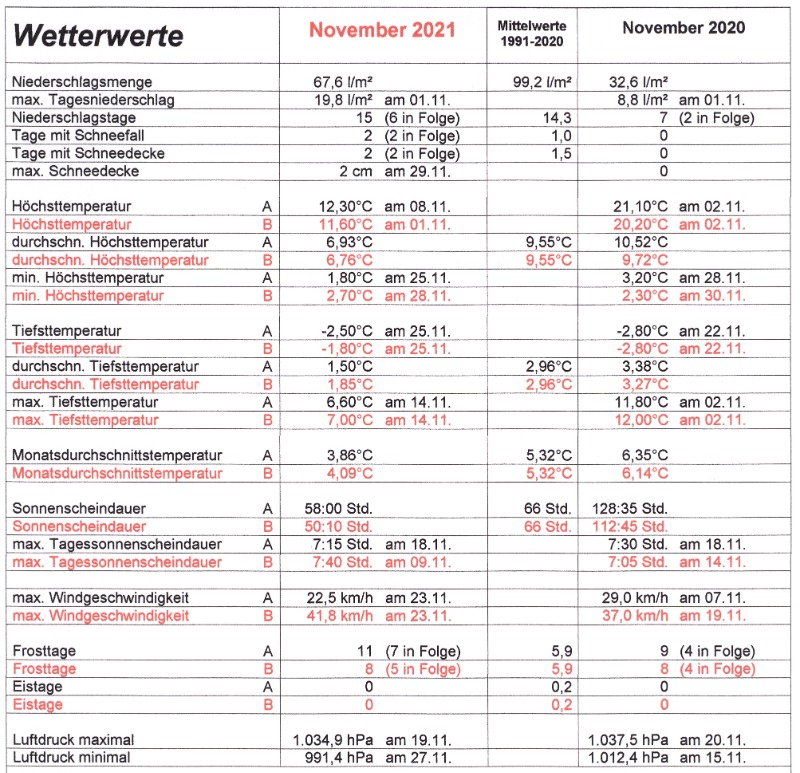 Mit 3,9°C lag im November die Durchschnittstemperatur 1,5°C unter der Norm von 1991 bis 2020. Bereits zum 4. Mal in Folge konnte der November den langjährigen Novemberniederschlag nicht erreichen, mit 67,6 l/m² war er 31,6 l/m² zu niederschlagsarm und die Sonne schien an 58 Stunden 8 Stunden unter der Novembernorm.