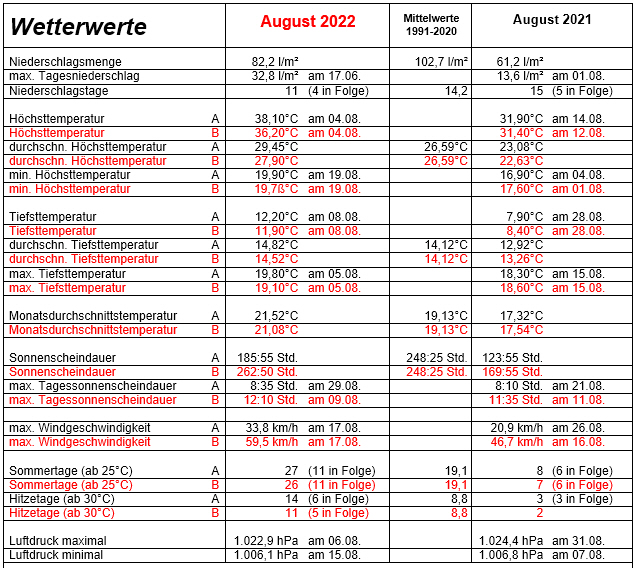 Auch zum Start in den letzten Sommermonat setzte sich die trockene Hitze unter dem Einfluss des Hochs „Normen“ fort. Die ersten 5 Augusttage waren allesamt Hitzetage (ab 30°C) wobei wir den Höhepunkt der erneuten Hitzewelle mit 38,1°C am 4. August hatten. Nachdem wir in der Nacht auf den 5. mit 19,8°C nur knapp die erste Tropennacht des Jahres verpasst hatten, beendeten gewittrige Schauer in der Nacht zum 6. August die aktuelle Hitzewelle. Mit 10,4 l/m² gab es den sehnlichst erwarteten ersten Regen des Monats und mit einer Tages-Höchsttemperatur von 21,8°C gab es wieder einmal eine erfrischende Durchlüfttemperatur. Ab dem 7. stiegen dann die Temperaturen mit Hoch „Oscar“ von Tag zu Tag ohne einen Tropfen Regen wieder an. So hatten wir am 8. mit 30,9°C bereits wieder einen Hitzetag. Unter dem Regiment von Hoch „Oscar“ und strahlendem Sonnenschein von früh bis spät waren bis zum 13. alle Tage Hitzetage. Am 14. verabschiedete sich Sonnenhoch „Oscar“ nach Nordosteuropa und am 15. brachten gewittrige Schauer 11,8 l/m² vom dringendst benötigten Regen. Nach diesen Gewitterschauern fiel in der ersten 3,4°C zu warmen Augusthalbzeit mit 22,2 l/m² erst 22% des normalen Augustniederschlages und die Sonne schien an 148 Std. schon 60% der Augustnorm. Mit wolkenlosen 30,9°C startete die zweite Augusthälfte mit dem 12. Hitzetag des Monats. Nachdem wir am 17. mit 29,6°C einen weiteren Hitzetag nur knapp verpassten, erreichten uns am Nachmittag und Abend 2 Gewitter, die insgesamt 32,8 l/m² Regen mit Hagel brachten, wobei in nur 10 Minuten 20 l/m² fielen. Unter der Regie von Tief „Karin“ und rund 11°C tieferen Durchlüfttemperaturen erhöhte sich die Monats-Niederschlagsmenge bis zum 22. August auf 66,2 l/m². Ab dem 22. war Hoch „Piet“ wieder Herr der Wetterküche und sorgte mit Sonne von früh bis spät für hochsommerliche Temperaturen. So kamen wir am 24. mit 30,9°C und am 25. mit 31,8°C zu 2 weiteren Hitzetagen. Am 26. löste Tief „Ornella“ Hoch „Piet“ ab, was zu mehr Wolkenfeldern sorgte, bei schwülen 29,4°C reichte es aber immer noch nicht für den dringend benötigten Regen. Erst am Abend des 27. brachte ein Schauer 8 l/m² Regen. Nach diesem willkommenen Regen war ab dem 28. Hoch „Quintin“ mit viel Sonnenschein und erneut hochsommerlichen Temperaturen wetterbestimmend. In der Nacht auf den 31. und am 31. brachten gewittrige Schauer nochmals 8 l/m² Niederschlagsnachschub und erhöhten die August-Niederschlagssumme auf 82,2 l/m, das sind 80% des Augustsolls.