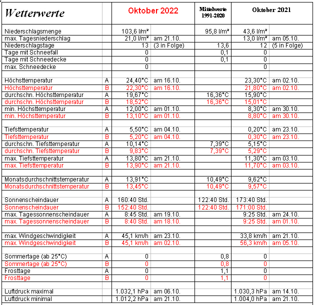 Unter dem Einfluss der Tiefs „Walburgia“ und „Xenia“ startete der mittlere Herbstmonat herbstlich grau, windig und nass. So fiel in den ersten 3 Oktobertagen mit 28,2 l/m² schon 29% des normalen Oktoberniederschlages. Nach diesem heißen und trockenen Sommer sind solche Regenphasen aber auch absolut notwendig und mehr Segen als Fluch. Am 4. übernahm Hoch „Timeo“ und ab dem 8. Hoch „Vangelis“ das Kommando und sorgten nach Auflösung der morgendlichen Nebelfelder für einen Hauch ruhigen goldenen Oktoberwetters. So stieg mit den eingeflossenen milden südwestlichen Luftmassen die Temperatur am 5. auf fast schon sommerliche 23,6°C an. „Danica“ „Elke“ und „Freya“ hießen die drei Protagonistinnen, die jeweils in Form atlantischer Tiefdruckgebiete das Wettergeschehen vom 13. bis zum 15. mit 29,6 l/m² Regen und für die Jahreszeit zu hohen Temperaturen im Griff hatten. Somit fiel in der ersten 2,7°C zu warmen Oktoberhalbzeit mit 58,4 l/m² schon 61% des normalen Oktober-niederschlages und die Sonne schien an 62 Std. 51% der Oktobernorm. Zum Start in die zweite Oktoberhälfte sorgte eine südwestliche Höhenströmung mit subtropischen Luftmassen für außergewöhnlich warmes und recht sonniges Wetter. Mit Föhnunterstützung hatten wir am 16. mit 24,4°C die höchste Temperatur des Monats. Tief „Georgina“ wurde am 20. wetterbestimmend und sorgte bis zum 22. neben kühleren, aber für die Jahreszeit immer noch zu warmen Temperaturen für 25,2 l/m² mit Saharastaub angereicherten Regen. Nach diesem Regen erwartete uns am 22. und 23. ein recht sonniges und warmes Wochenende, wobei ein starker Wind am späten Abend des 23. bei Temperaturen von über 20°C Windböen von über 45 km/h brachte. Tagestemperaturen von über 20 Grad, dazu Gewitter mit Starkregen: Was sich anhört wie eine Wettervorhersage im Spätsommer, spielte sich tatsächlich in der letzten diesjährigen Oktoberdekade ab. Bis zum 26. fielen bei Gewittern und Schauern nochmals 20 l/m² Regen. Zwischen Hoch „Zacharias“ über Osteuropa und Tief „Iris“ über dem Nordatlantik machte sich am 27. eine für die Jahreszeit ungewöhnlich warme Luftmasse über Spanien und Frankreich auf den Weg zu uns. Wen die fortgeschrittene Jahreszeit dazu verleitet hatte, Biergartenbesuche und Grillabende abzuschreiben, wurde durch das trotz Saharastaub sehr sonnige Spätsommerwetter bis zum Monatsende eines Besseren belehrt.