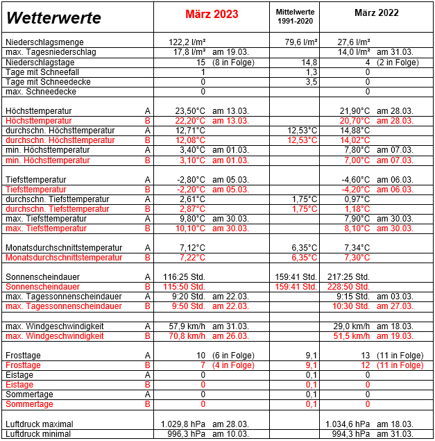 Am 1. März begann wie jedes Jahr der meteorologische Frühling. Das Wetter traute sich jedoch noch nicht so richtig bei diesem Jahreszeitenwechsel mitzugehen. Mit Hoch „Hazal“ war das Wetter zwar hochdruckbestimmt, aber die Hochnebeldecke löste sich die ersten 3 Märztage nur sehr zögerlich auf, wodurch das Temperaturniveau mit Höchstwerten zwischen 3 und 8 Grad noch recht gedämpft war. Erst ab dem 4. war die Märzsonne kräftig genug, die Hochnebeldecke aufzulösen. Dem Hochdruckgebiet „Hazal“ ging ab dem 7. langsam aber sicher die Luft aus, dadurch konnte sich Tiefdruckeinfluss durchsetzen. Die Sturmtiefs „Cornelis“, „Diethelm“ und „Flurin“ sorgten ab dem 8. für wechselhaftes Aprilwetter im März. Neben dem stürmischen Wind gehörten dazu auch die dringend notwendigen Niederschläge und eine Berg- und Talfahrt der Temperaturen. So gab es am 11. bei Temperaturen um den Gefrierpunkt den ersten Schneefall des Monats und 2 Tage später stieg die Temperatur mit 23,5°C auf die zweithöchste Märztemperatur seit Messbeginn und wir verzeichneten den ersten „warmen Tag“ (ab 20°C) des Jahres. Nach dieser abwechslungsreichen Wetterlage wurde die Trockenheit des Vormonats in der 1,8°C zu kalten ersten Märzhalbzeit zum Vorteil der Vegetation mit 59,4 l/m² (75% des normalen Märznieder-schlages) etwas abgeschwächt und die Sonne schien an 50 Std. 31% des Märzsolls. Hoch „Jeanine“ sorgte zum Start in die zweite Märzhälfte mit viel Sonnenschein und steigenden Temperaturen für eine Wetterberuhigung. Tief „Gerson“ brachte uns am Nachmittag des 19. März mit 17,8 l/m² 4,6 l/m² mehr Regen als im gesamten Monat Februar. Nach diesem sehr willkommenen Niederschlagszuwachs ging es pünktlich ab dem kalendarischen Frühlingsbeginn am 20. bis zum 24. unter dem Zepter von Hoch „Kali“ mit frühlingshaft mildem und recht sonnigem Wetter weiter. Die Tiefs „Hilmar“, „Johannes“ und „Khusru“ beehrten uns ab dem 24. bei zunächst noch frühlingshaften Temperaturen mit einem Wechsel aus Sonne, Regenschauern, Gewittern und Wind. So fiel am Nachmittag des 24. mit 13,8 l/m² mehr Regen als im gesamten Monat Februar. Als am 26. auf die Sommerzeit umgestellt wurde lies der Winter nochmals kurzfristig seine Muskeln spielen, denn mit einer nördlichen Strömung gelangte Polarluft in unsere Region. Nachdem am Morgen des 28. März die Temperatur nochmals auf minus 1°C sank, zeigten sich die letzten Märztage bei wieder steigenden Temperaturen sehr wechselhaft und windig.