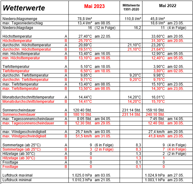 Nachdem die ersten beiden Maidekaden gegenüber der Norm von 1991 bis 2020 noch 1,3°C zu kühl ausfielen sorgte die letzte sommerlich warme und sonnige Dekade dem 51 Std. zu sonnenscheinarmen und 32 l/m² zu niederschlagsarmen letzten Frühlingsmonat doch noch für einen Temperaturüberschuss von 0,2°C.