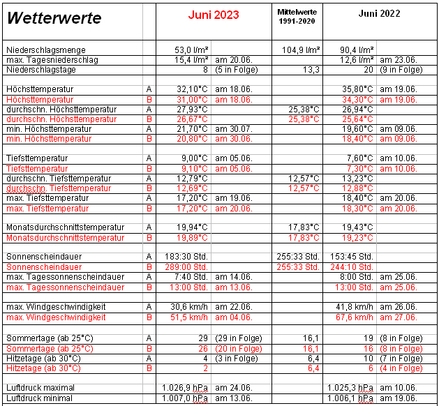 Mit 29 Sommertagen (ab 25°C) in Folge, nur der letzte Junitag blieb unter der 25-Gradmarke, war der 52 l/m² zu trockene und rund 33,5 Std. zu sonnenscheinreiche Juni 2023 mit einem Temperaturüberschuss von 2,1°C nach dem Jahrhundertsommer-Juni 2003 und dem Juni 2017 in 79739 Schwörstadt der drittwärmste Juni seit Messbeginn.
