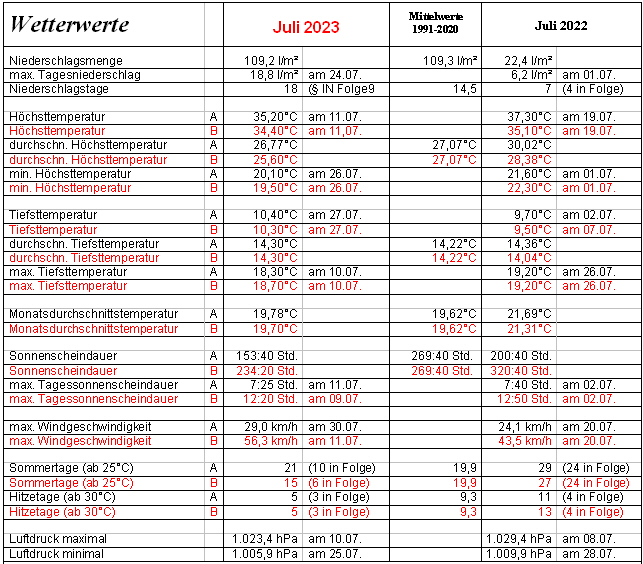 Der Juli startete unter der Regie der Tiefs „Nikolaus“ und „Otto“ sowie dem Hoch „Danica“ entsprechend dem eigentlich typischen mitteleuropäischen Sommerwetter leicht wechselhaft und mäßig warm bis warm. Die ersten Julitage verliefen bezüglich der Temperaturen unspektakulär, oft wurde nicht einmal die Sommermarke von 25 °C erreicht, das änderte sich aber ab dem 7. Juli. Im Zusammenspiel des Hochs „Evi“ über dem östlichen Mitteleuropa und dem Tief „Quentin“" über dem nahen Atlantik wurde mit einer tropisch angehauchten Luftmasse die zweite Hitzewelle des Jahres herangeführt. So verzeichneten wir am 7. mit 31,9°C den ersten Hitzetag (ab 30°C) des Monats und in der zunehmend angefeuchteten, wolkenreicheren Luftmasse brachte ein Gewitter am Morgen des 8. 15 l/m² Regen. Mit 35,2 °C verzeichneten wir am 11. die bisher höchste Temperatur des Jahres. „Endlich mal durchatmen“ hieß es ab dem 12 Juni, denn nach der extrem schwülen Hitze sorgte Tief „Ronson“ mit Atlantikluft vorübergehend bis zum 14. für angenehm kühlere Temperaturen. Am 15. stieg die Temperatur jedoch schon wieder auf 32,2°C an und am Abend sorgte ein Gewitter für 14 l/m² Regen mit Hagel, in 5 Minuten fiel 7,8 l/m² mit einer kurzfristigen Niederschlagsrate von 245,2 l/m² in der Stunde. Somit war die erste Julihalbzeit 1,1°C zu warm, mit 57 l/m² fiel 52% des normalen Juliniederschlages und die Sonne schien an 127,5 Std. 47% des Julisolls. Mit angenehm kühlen Nachttemperaturen, sommerlichen aber nicht heißen Tagestemperaturen, einem Wechsel aus Sonne und Wolken und gelegentlichen, sehr willkommenen Schauern und Gewittern startete die 2. Julihälfte mit einem Retro-Sommerwetter wie es früher einmal normal war. Tief „Unai“ sorgte ab dem 24. mit zunehmend kühlen und feuchten Luftmassen für Herbstfeeling inmitten der Hundstage, den normalerweise heißesten Tag des Jahres. Während den zum Teil heftigen Regenschauern sank die Nachmittagstemperatur unter 17°C. Ab dem 27. Juli stiegen die Temperaturen wieder an, so dass wir am 28. mit 26,4°C schon wieder sommerliche Temperaturen hatten. Die wechselhafte und in den vergangenen Jahren in den Sommermonaten sehr selten gewordene Westwetterlage mit mäßig warmer und feuchter Atlantikluft hielt bis zum Monatsende an.
