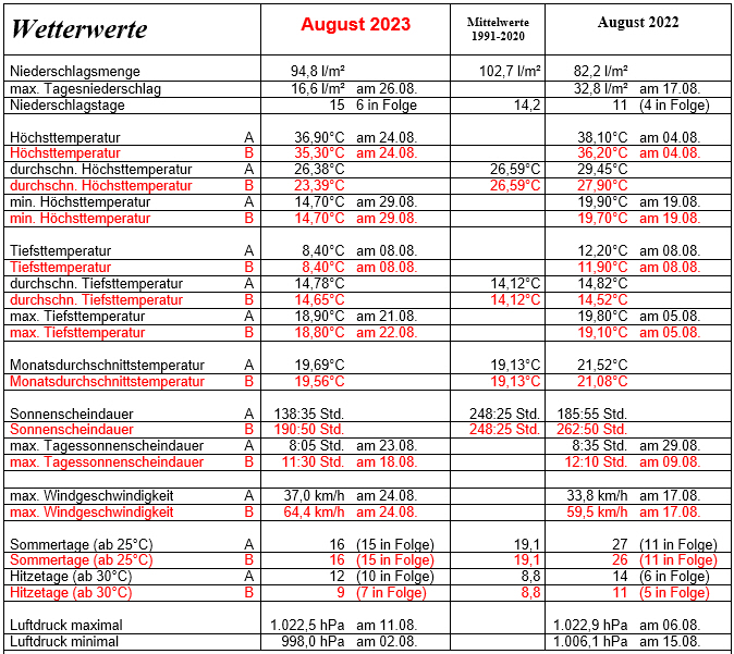 Mit einem herbstlich kühlen Start, einer tropischen Hitzewelle und erneut zu kühlen Temperaturen am Monatsende war der letzte Sommermonat in 79739 Schwörstadt von einem Achterbahnwetter geprägt. Der gegenüber der Norm von 1991-2020 0,6°C zu warme August war der 7. zu warme Monat in diesem Jahr, mit 94,8 l/m² war er 7,9 l/m² zu niederschlagsarm und die Sonne schien an 191 Std. 77% des Solls.