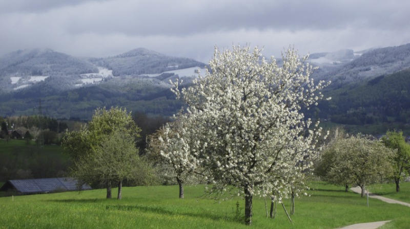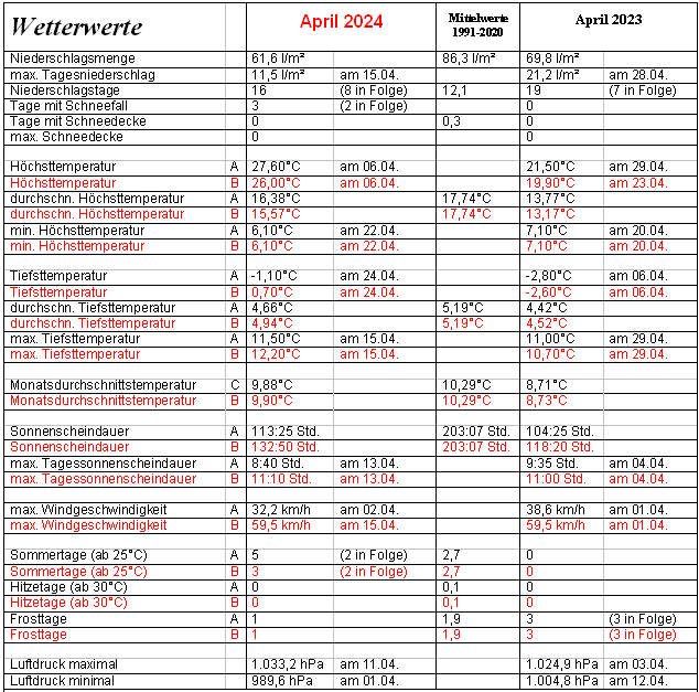 Wer am Ostersonntag noch nicht alle Eier gefunden hatte wurde am Ostermontag, dem Start in den April, beim Suchen nass. Die ersten 4 Apriltage brachten bei Tagestemperaturen von 11 bis 16°C unbeständiges windiges Wetter mit Regen und Schauern. Was uns ab dem 5. April erwartete hatte mit dem Monat April nur wenig zu tun, denn es ging vom Aprilwetter direkt in den Sommer. Mit Hochdruckgebiet „Olli“ floss aus Süden und Südwesten sehr warme und trockene Luft mit ordentlich Saharastaub im Gepäck zu uns. Am 6. April gab es mit 27,6°C, der höchsten April-Temperatur seit Messbeginn, den ersten Sommertag (ab 25°C) des Jahres. Nach diesem T-Shirt- und Kurzenhosenwetter leitete eine Kaltfront der Tiefs „Ursula“ und „Vanessa“ ab dem 9. einen massiven Luftmassenwechsel ein. So lagen die Tages-Höchsttemperaturen bis zu 16°C unter den vorherigen Sommertemperaturen. Nach Abzug der Kaltfront des Tiefs „Vanessa“ sorgte Hoch „Peter“ ab dem 12. für sonniges und wieder zunehmend warmes Wetter. Mit 26,9°C am 13. und 27,6°C am 14. verzeichneten wir 2 weitere Sommertage. Die 1. Aprilhalbzeit war somit 2,4°C zu warm, mit 26,8 l/m² fiel 31% des normalen Aprilniederschlages und die Sonne schien an 81 Std. 40% des Aprilsolls. In der Nacht auf den 16. April wurden mit der Kaltfront von Tief „Yupadee“ die warmen Luftmassen durch polare Kaltluft ersetzt. Von Mitternacht bis 6 Uhr morgens sank die Temperatur um 8,5°C, aus dem Frühsommer-Wetter wurde zum Start in die 2. Aprilhälfte nun feucht-kühles Aprilwetter. Auch an den folgenden Tagen zeigte sich der April von seiner launischen und kühlen Seite, denn mit Tief „Annina“ wurde weiter feuchte und kalte Luft polaren Ursprungs zu uns geführt. So stieg die Tages-Höchsttemperatur am 22. bei leichtem Schneefall gerade noch auf 6,1°C an und am 24. hatten wir mit –1,1°C den ersten Frost in diesem Monat. Am 27. kam die Umstellung der Großwetterlage vom Spätwinter in den Frühsommer. Anstatt dem kalten Nordwind erreichte uns deutlich wärmere Frühlingsluft aus Südeuropa. So verzeichneten wir am letzten Apriltag mit 25,6°C nochmals einen Sommertag.