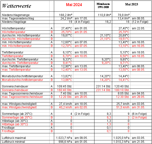 Der Wonnemonat Mai startete wie jedes Jahr mit einem Feiertag und im Gegensatz zum letzten Jahr mit Frühsommerwetter. So konnten die Maibummler mit viel Sonnenschein und 27,4°C auf den Regenschutz verzichten. Die Tiefs „Flurina“, „Gulla“ und „Helga“ beendeten mit feuchtlabiler und kühlerer Luft ab dem 2. Mai das Frühsommerwetter. An den Folgetagen blieb es mit Teils kräftigen Schauern bei dem wechselhaften und kühleren Wetter. Nach den zurückliegenden tiefdruckbestimmten Tagen sorgten die Hochs „Thomas“ und „Uwe“ pünktlich zum Fronleichnamfeiertag 9. Mai für ruhiges und recht sonniges Wetter. Mit einer frischen Bise mussten sich die Vatertagswanderer noch mit einer Höchsttemperatur von 18,4°C begnügen, am Muttertag 12. Mai stieg die Höchsttemperatur jedoch wieder auf sommerliche 27°C an. Ab dem 14. kamen wir zunehmend in den Einflussbereich der Tiefdruckgebiete „Ildiko“ und „Juli“. Mit Regenschauern blieben die Temperaturen jetzt deutlich unter der 20 Gradmarke. Die erste Maihalbzeit war somit 0,2°C zu kalt, mit 53,4 l/m² fiel 48% des normalen Mainiederschlages und die Sonne schien an 75,5 Std. erst 33% der Mainorm. Auch der Start in die zweite Maihälfte startete mit zum Teil ergiebigem Regen durch Tief „Katinka“ eher kühl. Das Pfingstwochenende 18. bis 20. Mai zeigte sich mit Temperaturen bis 24,4°C recht sonnig, bevor ein Gewitter in der Nacht zum 21. erneut einen Wetterwechsel einläutete. Tief „Lisa“ sorgte in der Folge mit einem Wechsel von Regenschauern und Aufheiterungen für beständig unbeständiges und kühleres Wetter. So lag die Tageshöchsttemperatur am 23. gerade noch bei 14,4°C. Bis zum Monatsende verblieben wir unter der tiefdruckbestimmten festgefahrenen Großwetterlage. Dabei kam es in mäßig warmer bis kühler und feuchter Luft immer wieder zu Regenschauern.