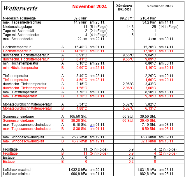 Der letzte Herbstmonat startete mit den Hochs „Yürgen“ und „Zayyan“ ruhig und mild. So stieg die Temperatur am 1. November bei 9:10 Stunden Sonnenschein auf 15,4°C an. Die zeitweise morgendlichen Nebel und Hochnebelfelder wurden mit Hilfe des „Möhlin-Jets“ schnell aufgelöst. So verzeichneten wir an den ersten 6 Novembertagen schon 52% der langjährigen November-Sonnenscheindauer und in der ersten Novemberdekade waren es bereits 65%. Nach 17 niederschlagsfreien Hochdrucktagen, der längsten Trockenphase des Jahres, gab es am 11. unter dem Einfluss des kleinräumigen Tiefs „Nelly“ 2,2 l/m² Regen. Ab dem 13. übernahm Hoch „Azzedine“ das Zepter und brachte uns ab dem 14. Dank dem „Möhlin-Jet„ wurde es ab dem 14. wieder viel Sonnenschein. Nach einer sternenklaren Nacht hatten wir am 14. mit –0,4°C den ersten Frost in diesem Herbst. Somit war die erste meist hochdruckbestimmte Novemberhalbzeit 1,1°C zu warm, mit 2,6 l/m² fiel nur 2,6% des normalen Novemberniederschlages und die Sonne schien an 55 Std. schon 84% des Novembersolls. Auch zum Start der 2. Novemberhälfte sorgte „Azzedine“ für sternenklare frostige Nächte und Sonnenschein von früh bis spät. Am 18. wurde die normale November-Sonnenscheindauer bereits um 3 Std. übertroffen. Die Tiefs „Pauline“ und „Quiteria“ setzten am 19. dem wochenlangen Hochruckeinfluss ein Ende. Statt Ruhe und Gemütlichkeit kam jetzt Schwung in die Wetterküche. Mit dem Durchzug von Tief „Quiteria“ ist am 21. polare Kaltluft zu uns eingeflossen. Am Abend und in der Nacht auf den Freitag 22.11. sorgte dann Tief „Renate“ für anhaltenden starken Schneefall. Mit einer Schneehöhe von 22 cm gab es die höchste November-Schneedecke seit Messbeginn 1997. Am 25. war die weiße Pracht wieder verschwunden, denn mit den Tiefs „Sigrid“ und „Telse“ wurde warme Luft aus Nordwestafrika zu uns geführt. So kamen die Niederschläge bis zum 28. wieder in Form von Regen herunter. Die letzten beide Novembertage brachte uns Hoch „Clemens“ ruhiges und trockenes Hochdruckwetter, aber der lebhafte und nebelauflösende „Möhlin-Jet“ fegte die letzen Blätter von den Laubbäumen.
