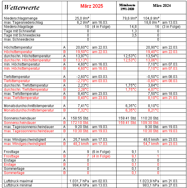 milde Frühsommerwetter wie im Mai blieb uns bis zum 9. erhalten. Mit 20,4°C verzeichneten wir am 9. März die höchste Temperatur seit dem 21. Oktober 2024. Am 10. verabschiedete sich das Sonnenhoch „Ingeborg“, wodurch wieder Bewegung in das Wettergeschehen kam. Nach 10 niederschlagsfreien Tagen in Folge fiel am 10. bei zurückgehenden Temperaturen 1l/m² Regen. Bis zur Monatsmitte blieb es mit der Zufuhr feuchter Meeresluft polaren Ursprungs bei dem tiefdruckbestimmten wechselhaften Wettercharakter. Somit war die erste Märzhalbzeit 0,4°C zu kalt, mit 10,2 l/m² fiel erst 13% des normalen Märzniederschlages und die Sonne schien an 94,5 Std. schon 59% des Märzsolls. Die zweite Märzhälfte startete am 16. weiterhin trüb und nass, bevor am 17. die Hochs „Juma“ und „Konstantina“ eine Verbindung eingingen und in der Folge für zunehmendes sonniges und warmes  Wetter sorgten. So gab es am 22. mit 20,6°C die bisher höchste Temperatur des Monats und Jahres. Nach 6 niederschlagsfreien Frühlingstagen verlor das stabile Hoch „Konstantina“ am 23. seine Wetterwirksamkeit. Somit war mit den Tiefs „Volker“ und „Wilfried“ der Weg für wechselhaftes Frühlingswetter mit leichten Regenschauern frei. Die letzten beiden Märztage zeigten sich unter dem Einfluss von Hoch „Noemi“ bei für die Jahreszeit entsprechenden Temperaturen und einer auflebenden Bise (Ostwind) wieder recht sonnig.