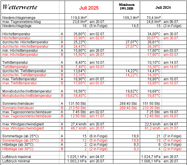 Mit nur 15 Sommertagen (ab 25°C, Norm 19,9 Tage) und nur 2 Hitzetagen (ab 30°C, Norm 9,3 Tage) war der 10,3 l/m² zu niederschlagsreiche und 56 Std. zu sonnenscheinarme mittlere Schwörstädter Sommermonat mit einem Temperaturdefizit von 1,1°C der kälteste Juli der letzten 4 Jahre.