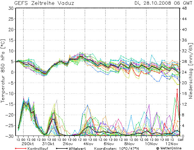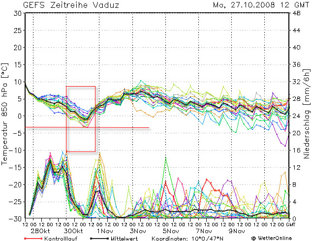 Auch hier ist der Temperaturrückgang zu erkennen. Aber grosse Sorge bereitet mir die Streuung innerhalb des "Kasten B". Die Verläufe des hellblauen und hellgrünen Simulationslaufs sind bedenklich hoch. Am 30. Oktober existiert eine Streuung von annähernd 15K (15°) und dies ist doch extrem viel. Das heisst, der Wintereinbruch ist alles andere als fix - auch in den Bergen. Träfe die Situation der Berechnungen "hellgrün" ein, dann gäbe es während der ganzen Periode nicht mal auf 1600m Schnee!
