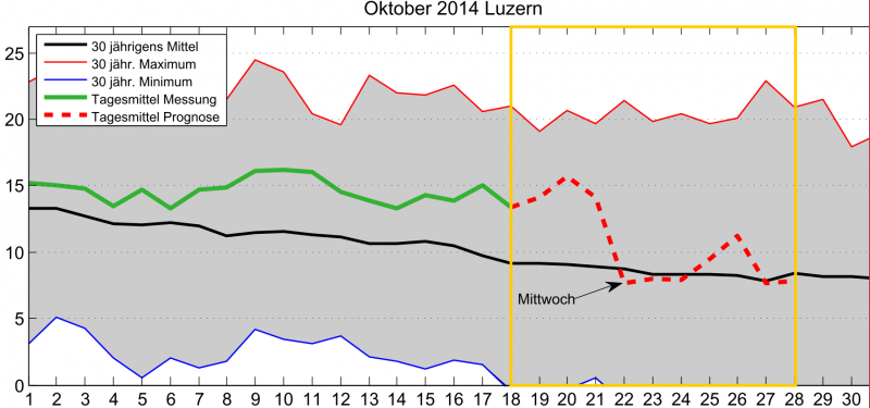 Die angehängte Grafik zeigt den Temperaturverlauf (Tagesmitteltemperaturen) im Oktober für Luzern. Die Messungen sind grün, die Prognose rot gezeichnet. Nach dem heutigen Stand schneidet der Oktober in Luzern trotz dem #Kälteeinbruch 3 Grad zu warm ab! Die schwarze Linie deutet darauf hin, dass der kühle Mittwoch im Oktobermittel ganz normal ist.