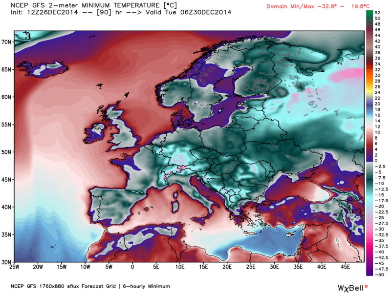 Latest GFS model guidance for minimum temperature across Europe on Tuesday's morning when arctic airmass spreads far south across much of European continent. Notice morning temps below freezing for much of Italy, Iberia, UK and even N Africa!