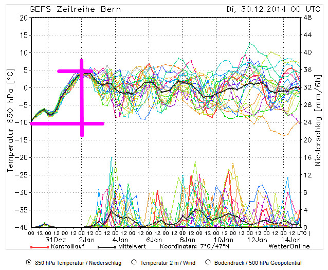 Die angekündigte Kältewelle hat sich als "Kältewellchen" herausgestellt und bis am 2. Januar werden die Temperaturen selbst auf 1500müM auf +5° ansteigen. Am Samstag kommt es schiffen !