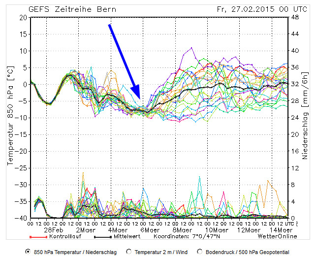 Nächsten Donnerstag und Freitag schauts nämlich ganz dolle nach Schnee aus! Im Stau der Alpen könnte wiederum locker ein halber Meter zusammenkommen. Und ach ja, kalt wirds auch. Die Temperatur sinkt auf 1500müM bis auf rund -9°. Das heisst dann für denMittellandbereich im März rund so um den Gefrierpunkt - tagsüber!
