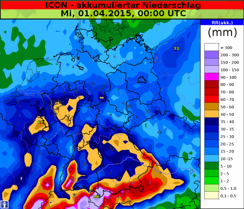 Puh! Das wird ganz schön stürmisch und nass in den kommenden Tagen. Das hat nichts mehr mit Frühlingswetter zu tun. Hier mal die aktuelle Prognose des Gesamtniederschlags des DWD-Wettermodells ICON bis Mittwoch (2 Uhr MESZ). Ganz besonders nass wird es demnach in den West- und Nordweststaulagen der Gebirge. Im Schwarzwald und im Allgäu sind sogar unwetterartige Niederschlagssummen wahrscheinlich.