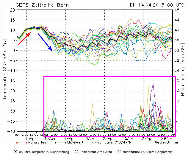 Auf die Hausse folgt die Baisse. Das verhält sich im Aktienhandel so und ebenso bei unserem Aprilwetter Vor allem in der Höhe wirds empfindlich kühler werden. Und insgesamt folgt offenbar wieder eine eher nasse Phase.
