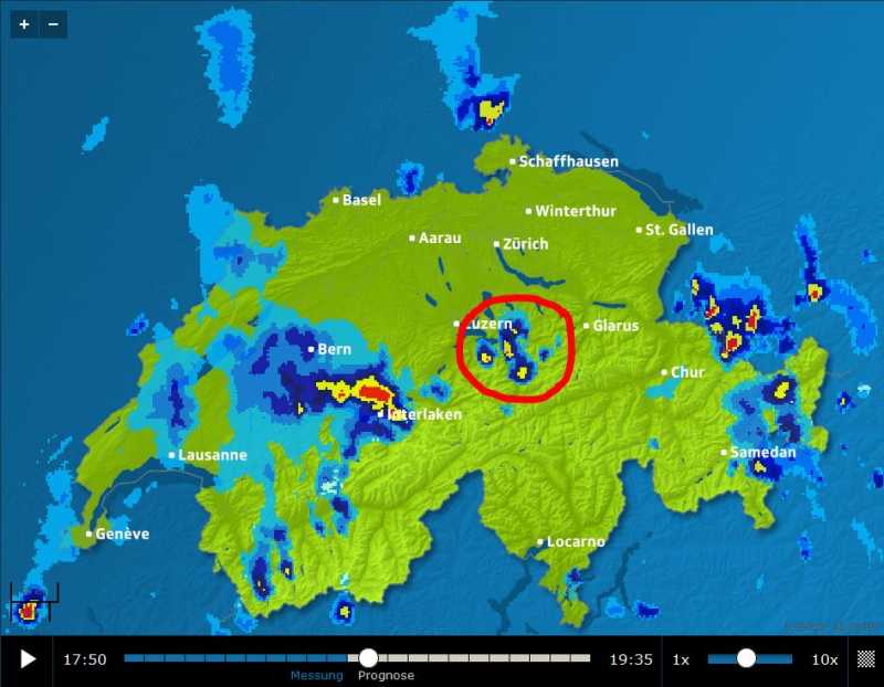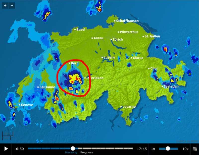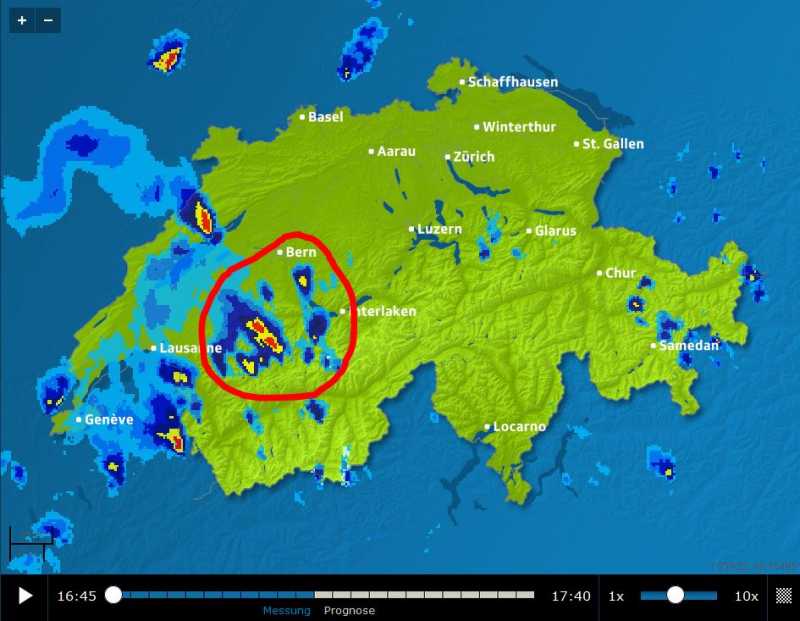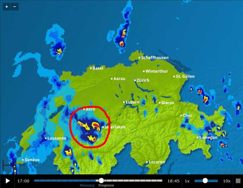 In einem Dreieck Interlaken, Saanen, Bern kam es gerade eben (17.40 Uhr) zu einer Symbiose dreier Gewitterzellen. Bereits vor der Symbiose dürften in der ersten Gewitterzelle aus dem Simmental sowie in der zweiten, die sich südöstlich von Bern vor gut eineinhalb Stunden bemerkbar machte, im innersten Teil Hagel gefallen sein, etwa bei Thun, das vom zweiten Gewitter schon passiert wurde. Die dritte Gewitterzelle über dem Niesen blieb seit über einer Stunde stationär stehen.