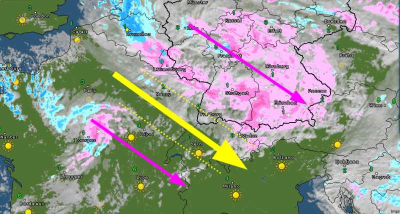 Der grosse "Deutschlandbatzen" (EMMA) zieht sowieso gegen Oesterreich und streift wohl wirklich nur den äussersten Osten der Schweiz. Und das kleine Mikrotiefchen (Komma) über Frankreich zieht wohl über Genf zu den Westalpen.