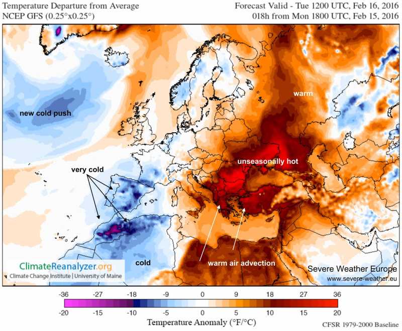 Für heute macht der Sommer mal einen Ausflug und reist von Afrika über Griechenland bis weit in den Norden. Temperaturen über 25° sind dabei keine Seltenheit! Im Gegenzug friert man in Spanien und Marokko bis weit in die westliche Sahara. Wenn das mal nicht krass ist?