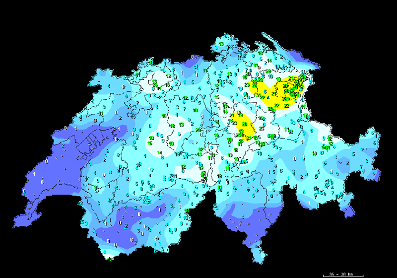 Dachte ichs mir doch. Meteocentrale gab vorhin diese Schneefallprognose raus. 20cm im Alpsteingebiet, Appenzellerland und Teilen des Glarnerlandes. Also üblich bei solchen Wetterlagen. Nix da mit 20cm im Mittelland. Ich rechne mit 20 SCHNEEFLOCKEN hier ;-)