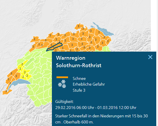 Doch am Montagmorgen veröffentlichte MeteoSchweiz eine Warnung über 15 bis 30cm Schnee im Raum Solothurn! Und MeteoSchweiz ist ja eher konservativ. Also dachte ich, ohh, da kommt wohl doch was. Aber im Verlauf des Morgens wurde erneut klar: "Das wird nix". Und die Warnung blieb natürlich bis Am Abend draussen. Unprofessionell.