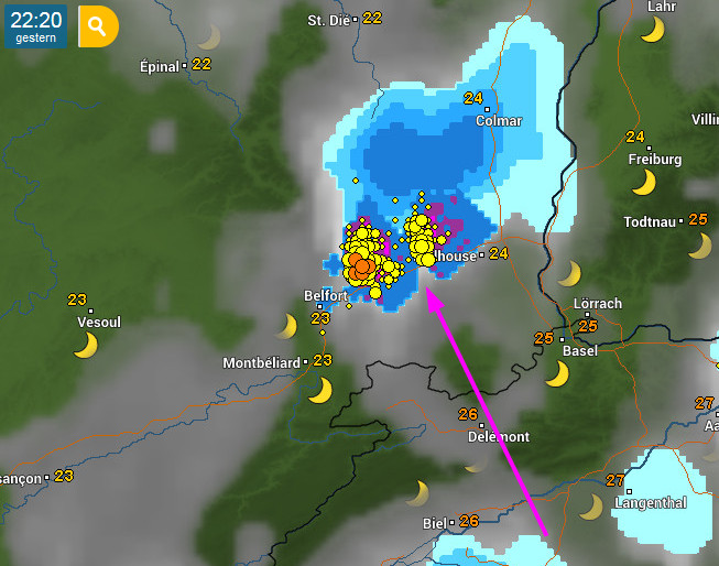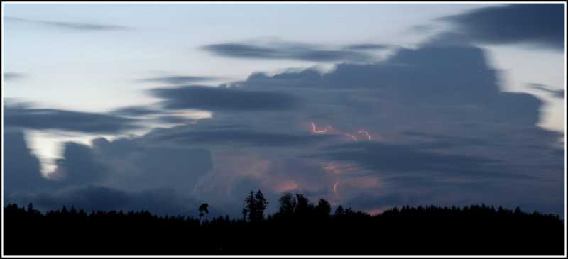 Hier noch ein Bildchen von gestern Abend beim Eindunkeln. Es bildete sich eine äusserst aktive Gewitterzelle über den Vogesen (F). Den Gewitterturm sah man ÜBER den Jura bis ins schweizer Mittelland Immerhin 100km Entfernung! Da sie nordwärts zog, sah man von Süden an die "saubere" Seite der Zelle (ohne Regen) und konnte deshalb auch Blitze klar erkennen. Eine Seltenheit auf diese Distanz.