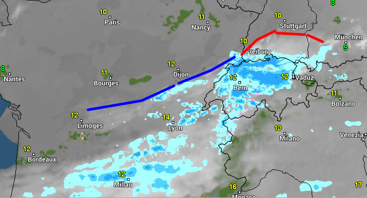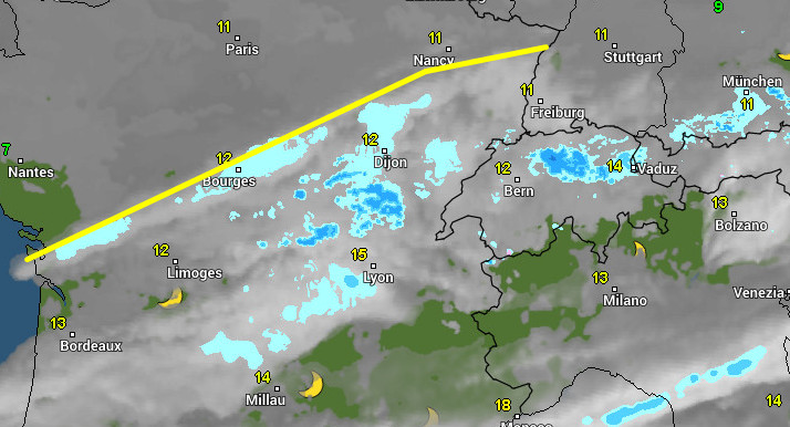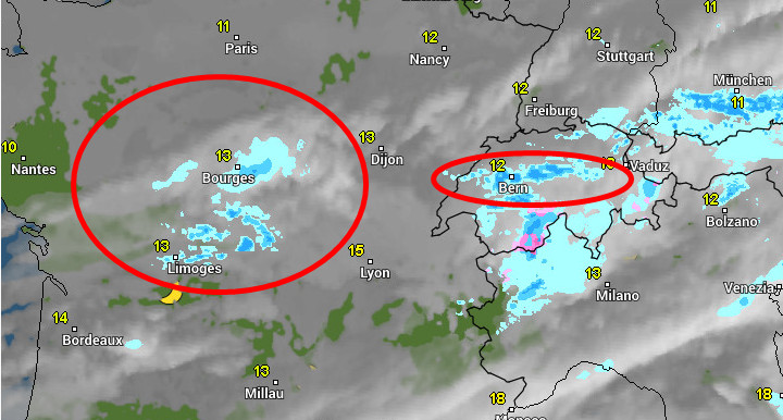 Man beachte die - wie vorgesehen - vorhandene alte Niedeschlagszone, welche als Rest den Alpen entlang schleicht. Über Mittelfrankreich aber ein Gebiet, welches von West nach Ost driftet. Darin eingelagert kleinere Schauergebiete.