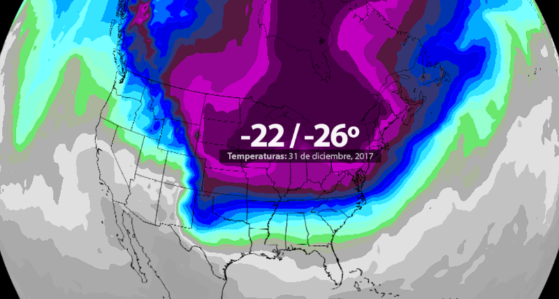 Wir sprechen von Temperaturen von fast 20 Grad unter Null in Städten wie Chicago, Illinois (der drittbevölkerungsreichsten Stadt der Vereinigten Staaten). Bemerkenswert ist auch die -20/-22ºC Vorhersage für Detroit (Michigan) und bis zu -26ºC! in Minneapolis, Minnesota.
