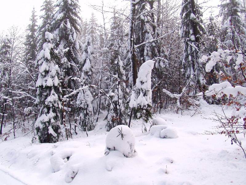 Anders schauts auf den Bergen aus. Ab 1000 m, an Osthängen ab 800 m, sind noch alle Bäume voll Schnee und es gab Neuschnee.