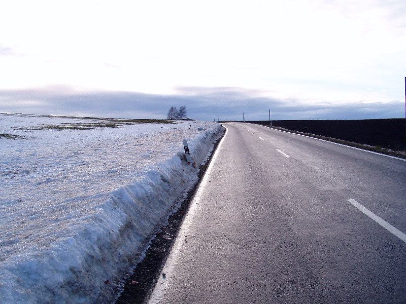 Nachher auf der Fahrt zur Ostseite des Hohenbogens. Hier hat der Böhmische vor einigen Tagen bis 50 cm hohe Wehen aufgetürmt. Die andere Straßenseite ist dagegen schneefrei.