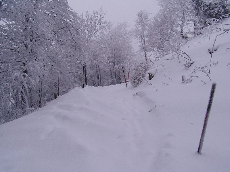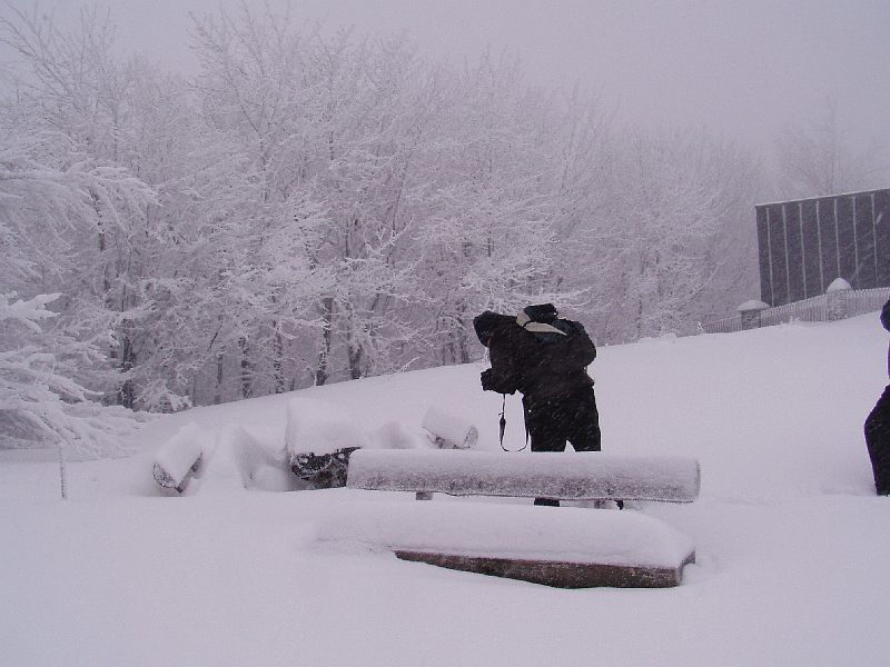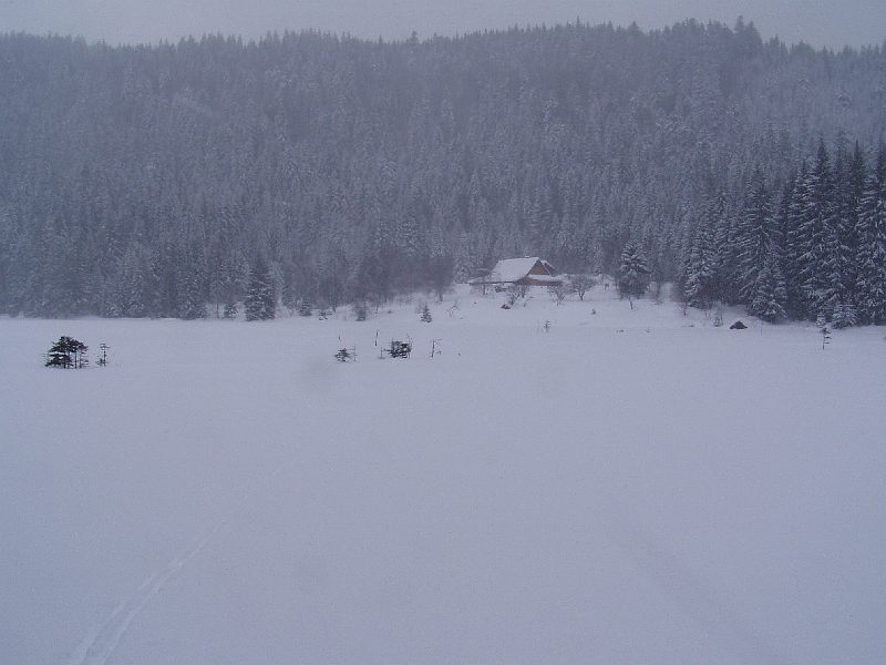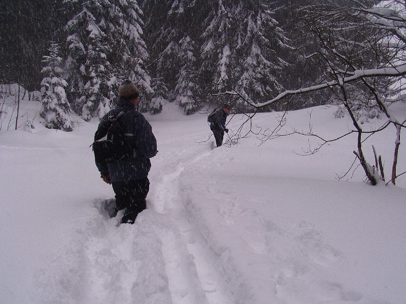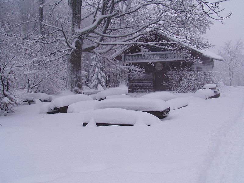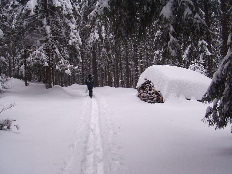 Der Weg zum Kl. Arbersee war dann sehr beschwerlich. Bei starkem Stauschneefall sank man tw bis über die Hüfte ein und man kam kaum vorwärts. Wenn einer den durch einen Langläufer vorgespurten Weg verließ und vielleicht mal kippte, war es schwierig, ohne Hilfe der anderen aus dem Schnee rauskommen.