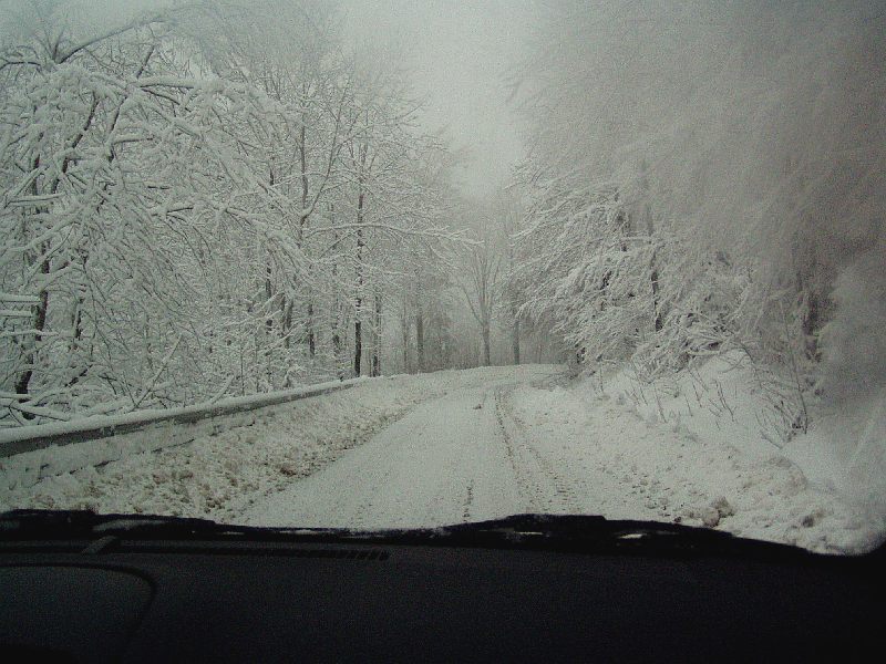 Nicht grad empfehlenswert: Abfahrt auf der schneebedeckten Straße mit 19% Gefälle. Bremsen darf man da nicht.