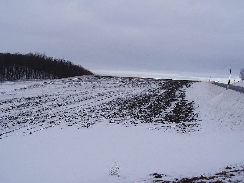Ich durchfuhr am Fuß des Hohenbogen (Ostseite, am Bild die Straße rechts weiter) ein Gebiet, wo das Autothermometer +3° anzeigte und es stark taute.