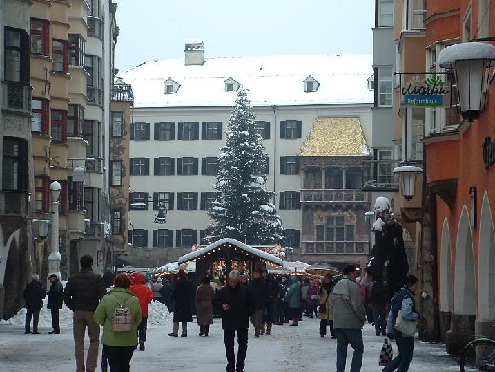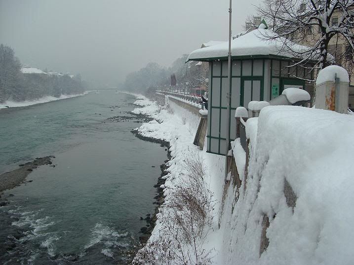 Innsbrück , 23 december am späten nachmittag , an der Inn, und der christkindlmarkt