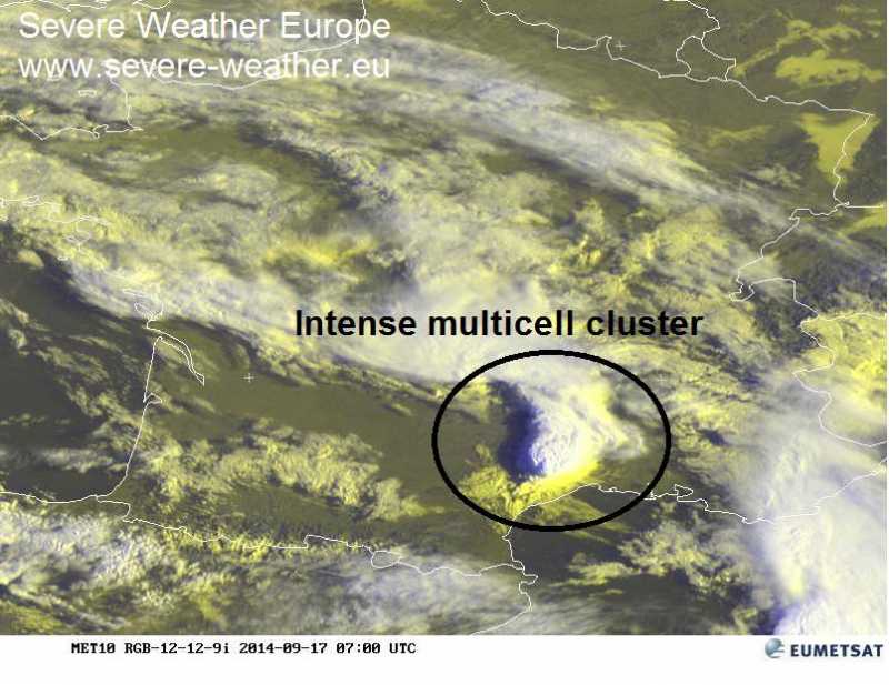 Ebenfalls heute Morgen über Sudfrankreich: Ein Multizellen-Cluster am Südrand des Massvi-Central. Der Cluster ist mehrheitlich stationär und produziert unglaubliche Regenmengen: