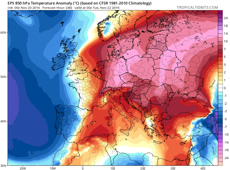 Ganz anders über Mittel- und Osteuropa: Krasse Temperaturüberschüsse bis 14°!