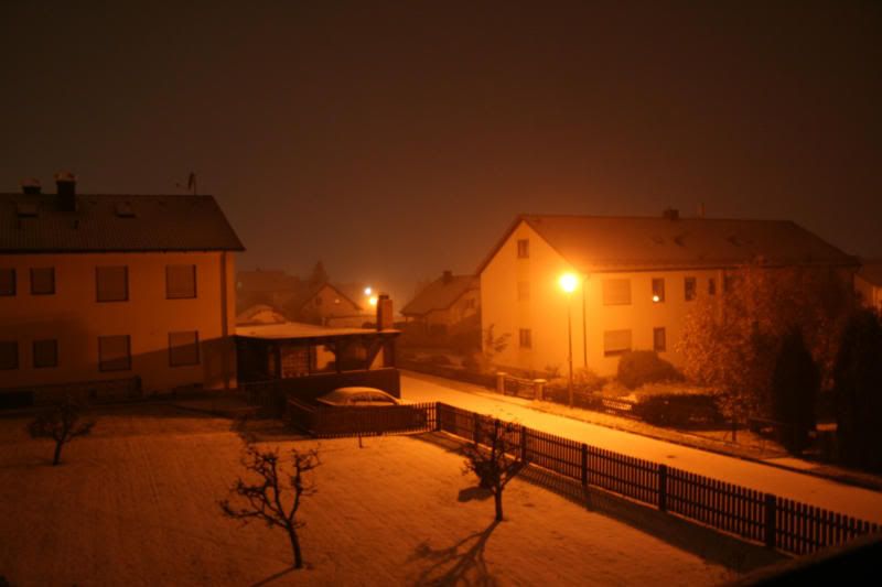 Der erste reinrassige Schnee, heute morgen schonmal Schneeregen, ist eben in einem Schauer gefallen. Die Temperatur sank laut Autothermometer kurz auf 2,5°C.