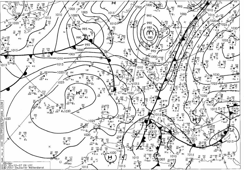 Die Bodenkarte von heute früh zeigt das vorderseitige Bodentief mit der okkludierten Front, die zwei verschiedene Luftmassen voneinander trennt. In ihrem Bereich erfolgt die Genese von teils heftigen Gewittern, die natürlich von dem Zeitpunkt dieser Karte bis jetzt noch weiter östlich vorangekommen sind.