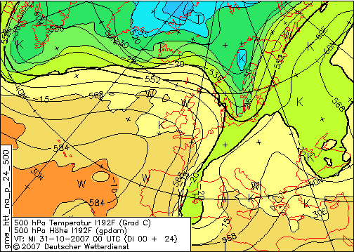 Schauen wir auf die Verteilung des Geopotenzials der 500 hPa-Fläche: Das Zentrum des Abtropfprozesses liegt über den Baleraen, während vorderseitig dieses Geschehens Richtung Korsika und Sardinien noch recht warme Luftmassen transportiert werden.