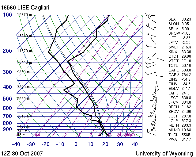 Noch ein Blick auf die Radiosondenaufstiege: Cagliari auf Sardinien heute mittag. Bis weit über das 500 hPa-Niveau eine südwestliche bis südliche Strömung mit entsprechender WLA. Feuchtlabile Schichtung mit Möglichkeit zur Konvektion bis etwas höher als 250 hPa.