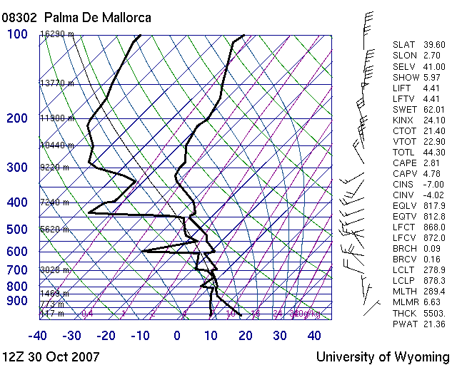 Grundlegend anders das postfrontale (frontrückseitige) Mallorca. Hier ist der Wind bodennah schon auf Nord bis Nordost gegangen, was an der Lage der Bodentiefkerne liegt. Oberhalb der Grundschicht bishin zur Tropopause in ca. 330 HPa herrscht Westsüdwest- bis Westnordwestströmung. Das Einfließen nieder- und mitteltroposphärisch kühlerer Luft hinter der okkludierten Front erzeugt natürlich eine Stabilisierung, so dass es bis in 600 hPa hinaus zur Genese mehrerer Inversionen kommt und keine Gewitter mehr auftreten.