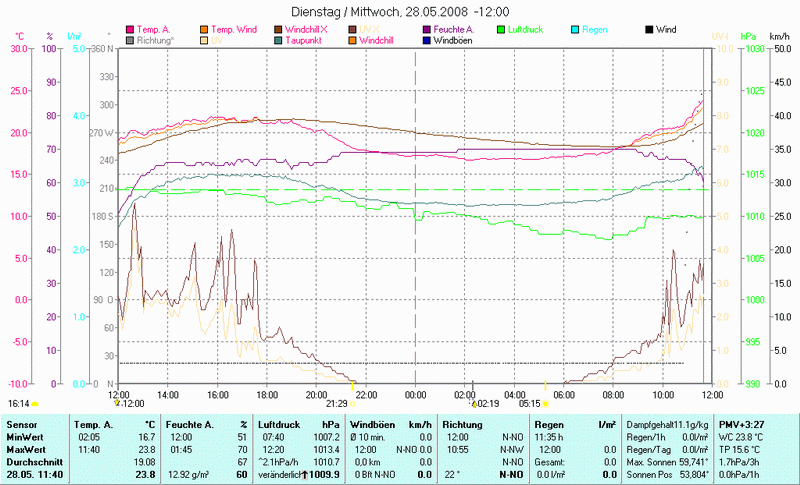 der Luftdruck weiß nicht recht was er machen soll. Immer wieder Sprünge nach oben oder unten. Dazu sommerliche Temperaturen um 26°C und rund 70% LF draußen in freier Wildbahn. Richtig schwül bei dicken flächendeckenden Cirren am Himmel