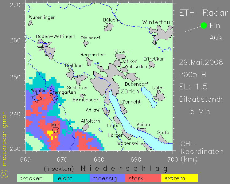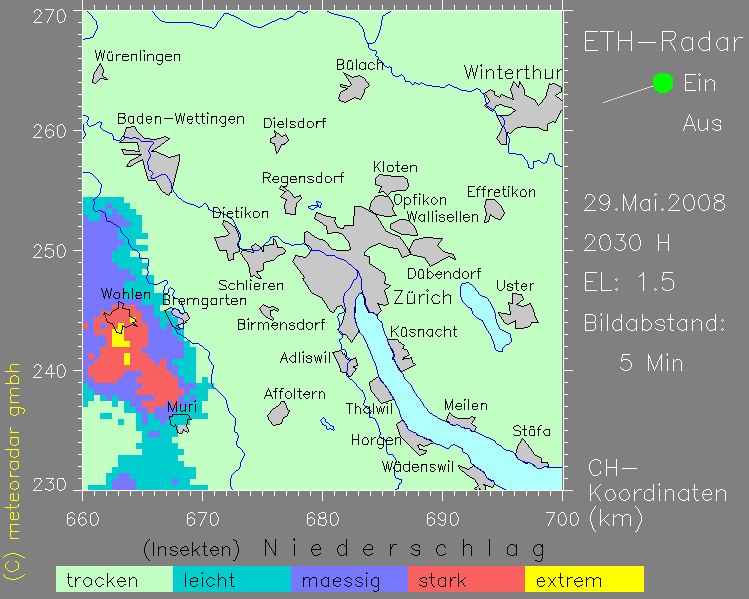 Hier in Wohlen seit kurz nach 20 Uhr Gewitter, dazu zeitweise heftiger Regen, aktuell etwas Graupel mit dabei. Auf dem Radarbild wohnen wir im unteren, linken Zipfel von Wohlen, dort, wo das letzte Bild "gelb" ist. :D