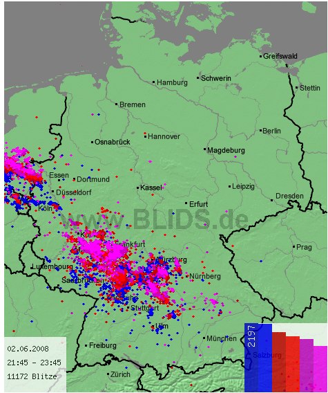 Starker Regen (bislang 29 mm/93 Minuten) und sehr hohe Blitzfrequenz.