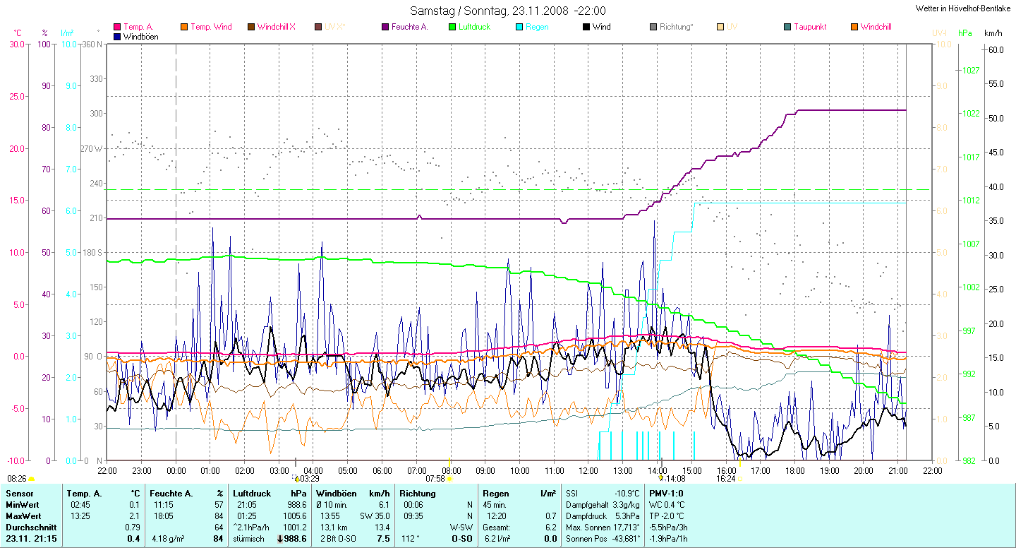 Unglaublich! Obwohl der Luftdruck seit heute Mittag rasant sinkt, frischt der Wind überhaupt nicht auf. Im Gegenteil, um halb vier Uhr schwächte sich der Wind sogar plötzlich ab.