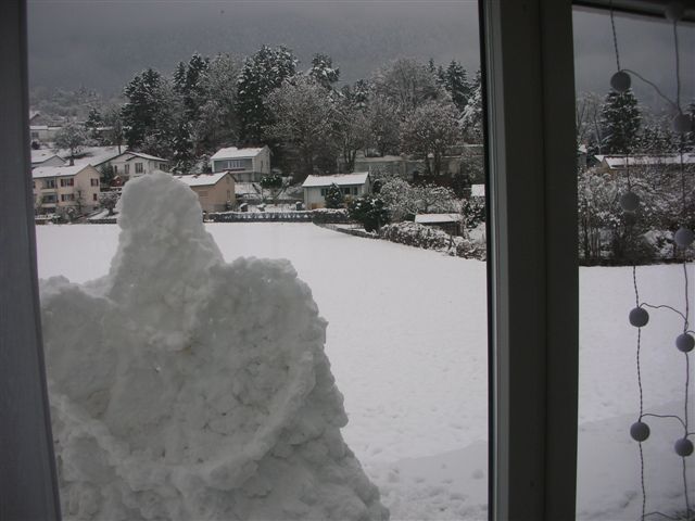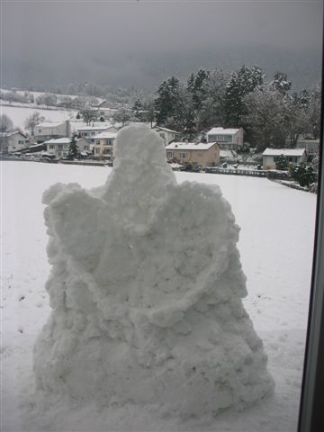(Unter uns Pfarrerstöchtern gebe ich dir einen Tipp!). Erst einen grossen Haufen Schnee ziemlich kompakt und feucht muss er sein, gut anklopfen dann mit Pflasterkelle grob herausschnitzen und anschliessend mit Lederhandschuhen formen. Ja auch das gibt kalte Finger...