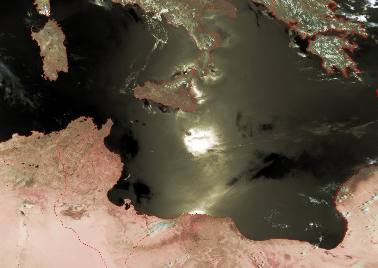 Ich hätte jetzt doch auf Wolken oder Saharastaub getippt... Ich denke, die hellen Flächen sind Wolken, welche zum richtigen Zeitpunkt im richtigen Winkel standen und so diese hellen felder abgeben. Aber eben, ist nur ein Tipp.