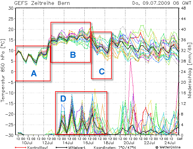 In der kühlen "Phase A" stecken wir noch einige Tage. "Phase B" wird kaum zum Aushalten: die Hitze kommt mit einem Schlag zurück. Und in der "Phase C" wirds schon wieder kühler. Bemerkenswert die grosse Niedrschklagsneigung während der Hitze ("Phase D").